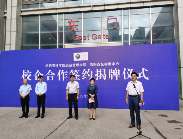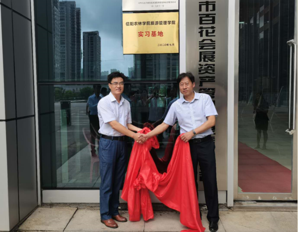 2020年7月28日,beat365在线平台官网旅游管理学院与信阳百花会展资产管理有限责任公司在信阳百花会展中心举行校企合作签约揭牌仪式。副校长赵一鹏、信阳市财政局党组成员、市担保服务中心主任叶中林、旅游管理学院院长刘开华、旅游管理学院党总支书记陈建国、信阳市百花会展资产管理有限责任公司党支部书记、总经理马莉出席揭牌仪式,旅游管理学院部分专业教师及百花会展中心全体工作人员参加。