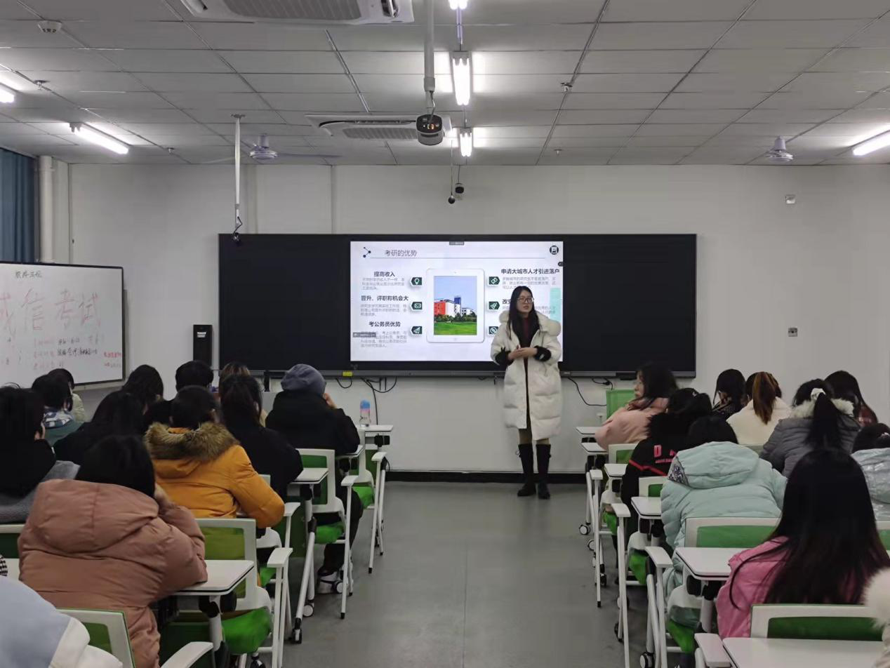 张钰老师介绍了考研具有帮助同学们提升学历、增加就业机会、养成良好的学习习惯、锻炼坚强的意志等众多优势,提醒大家一定要将自身兴趣、优势和就业规划结合起来选择专业,选择因素切忌不要单一。赵岑老师讲解了旅游管理研究方向,包括旅游资源开发与规划、旅游企业管理、旅游产业发展研究等,并向大家推荐了郑州大学、河南大学、河南师范大学、河南财经政法大学等省内高校。陈芳老师详细解释了中国研究生考试的流程、考试时间、考试科目,以及郑州大学、河南大学、信阳师范学院的旅游管理专业招生目录和招生要求,鼓励同学们要相信努力了总会成就属于自己的半壁江山。