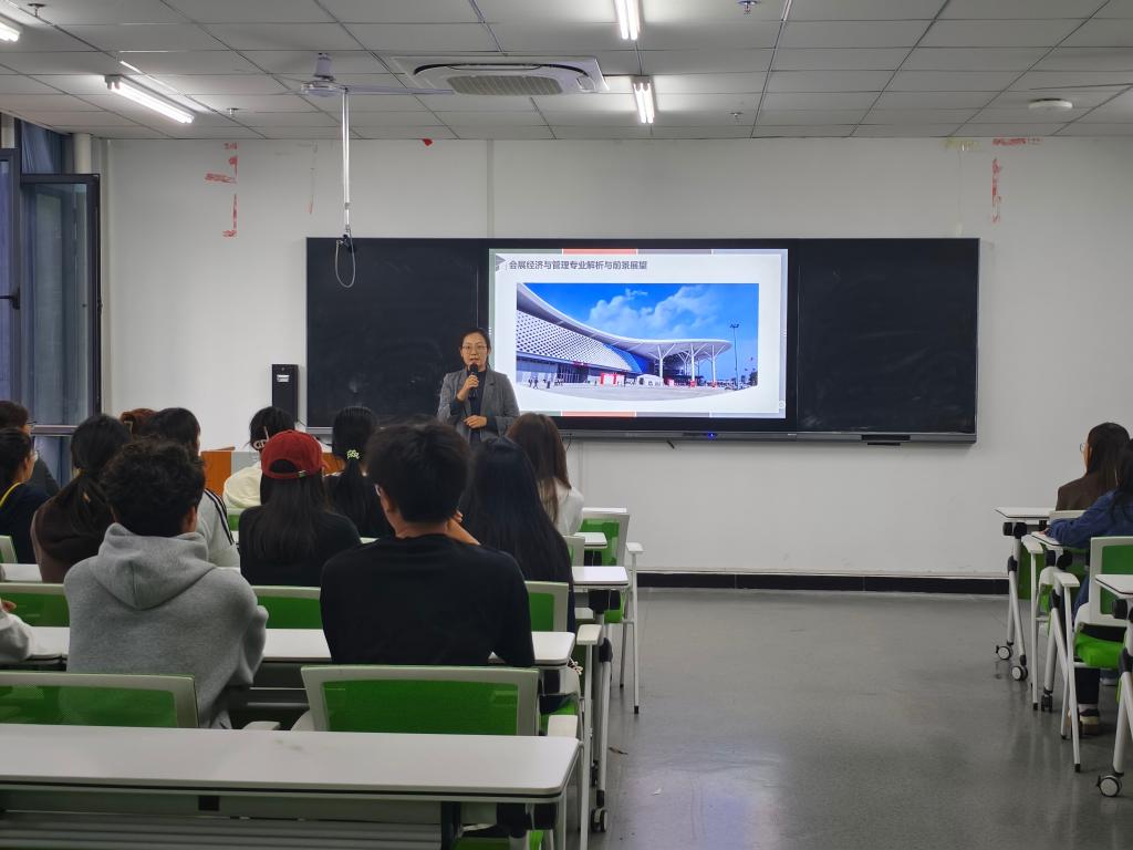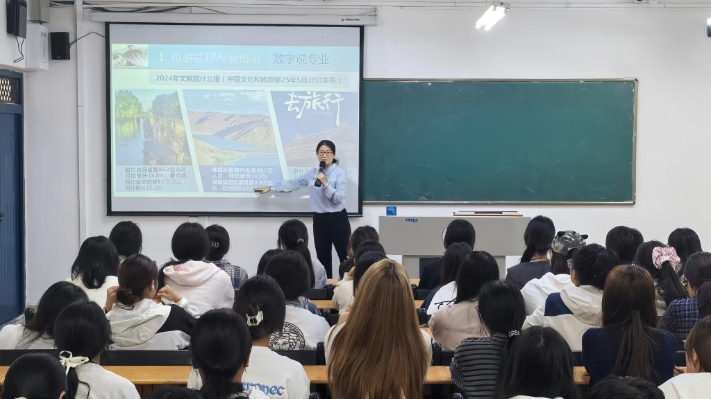 旅游管理专业教研室主任王亮亮结合2024年旅游业发展的新形态与2023年旅游经济数据,深入剖析了当前旅游市场复苏的强劲动力与行业转型的多元机遇,指出旅游产业正迎来新一轮高质量发展周期。她围绕旅游管理专业的课程结构、实践教学平台与职业发展路径,系统介绍了“理论+实践+创新”三位一体的课程体系,强调通过项目驱动、校企协同等方式强化学生的专业素养与综合能力。她还就大学生活规划、实训条件建设以及未来就业方向等方面,与同学们展开深入交流,鼓励大家扎实学习、积极实践,不断提升自我竞争力,为成长为具备国际化视野与管理能力的高素质旅游人才奠定坚实基础。