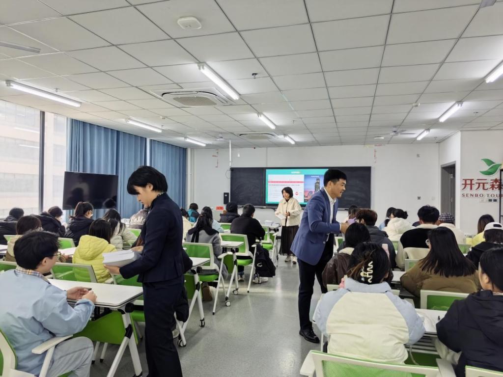下午,陈鹏为在校的2024级和2022级开元菁英班学员授课。课前为大家发放了开元旅游产业学院基于企业运营实践编撰的学习资料。课上,陈鹏结合行业变革现状,分析了文旅产业变革下的人才需求,并指出大学生的职业准备路线,拓宽了学生的行业视野,使学生更加明晰了未来的发展方向与路径。