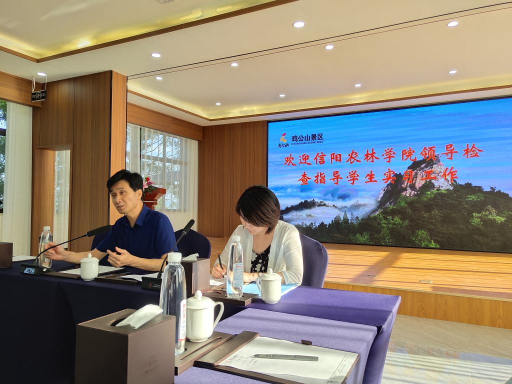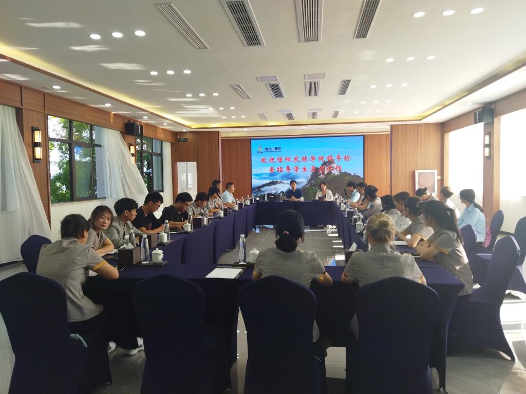 2021年7月24日,旅游管理学院院长刘开华带领副院长陈婷、实习指导老师程雪一行到鸡公山风景区,检查看望2019级实习生。鸡公山风景区人事部艾平、酒店部负责人许志琳和2019级全体实习生参加座谈会。
