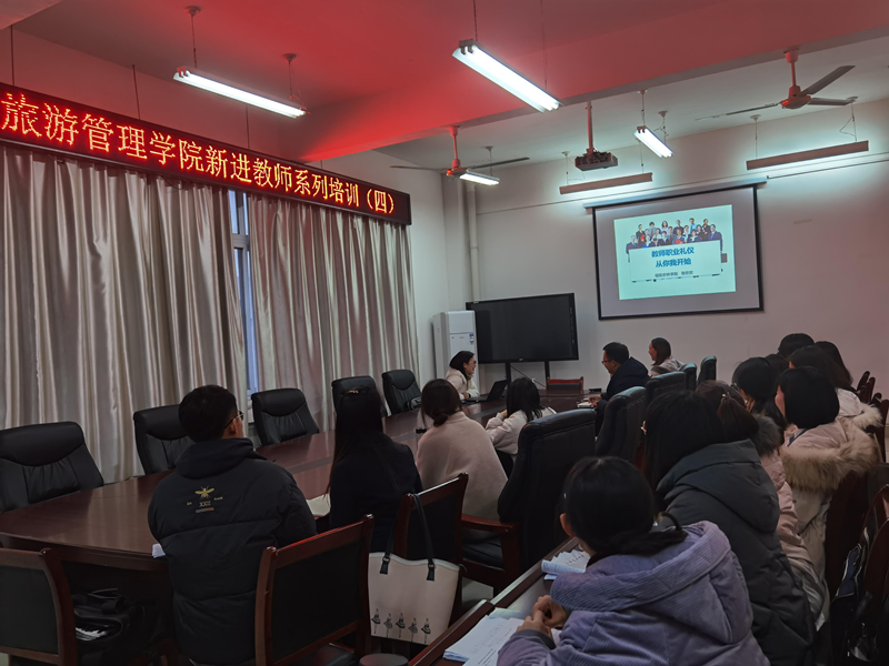 为提升教师形象气质,规范教师着装及授课礼仪,12月9日下午,旅游管理学院在科技楼1C502召开第四次全院新进教师系列培训活动,本次培训由旅游管理学院教学秘书张欢欢主讲,近两年新进教师参加。