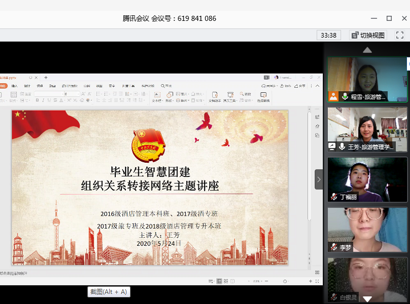 为更好地运行“智慧团建”系统并做好2020届毕业学生团员团组织关系转接工作,受疫情影响,2020年5月24日旅游管理学院利用腾讯会议线上开展了“毕业生团员团组织关系转接工作讲座”活动。此次讲座活动由旅游管理学院王芳老师主讲,毕业班级辅导员及16级毕业班班长、团支书参加了此次培训活动。