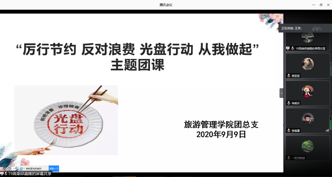 为了响应习近平总书记号召,营造“厉行节约、反对浪费”的社会风尚,弘扬勤俭节约美德,引导学生提高“光盘”意识,旅游管理学院团总支书记王芳老师于2020年9月7日晚20:00在线上开展“厉行节约 反对浪费 光盘行动 从我做起”主题团课。