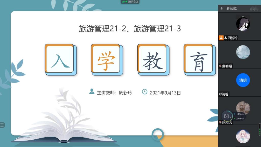 根据学校相关通知安排,旅游管理学院于9月13日召开了2021级新生线上入班教育主题班会。班会由各班辅导员主持。