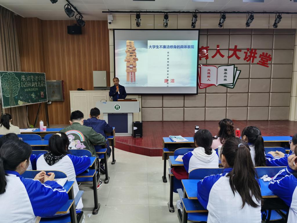 为了引导新生树立廉洁自律观念,自觉践行社会主义核心价值观。10月10日,旅游管理学院在一教E101开展新生入学教育之大学生廉洁教育党课。党总支副书记杜丽、院科级干部和2021级辅导员、全体新生聆听了本次党课。党课由院党总支书记陈建国主讲。