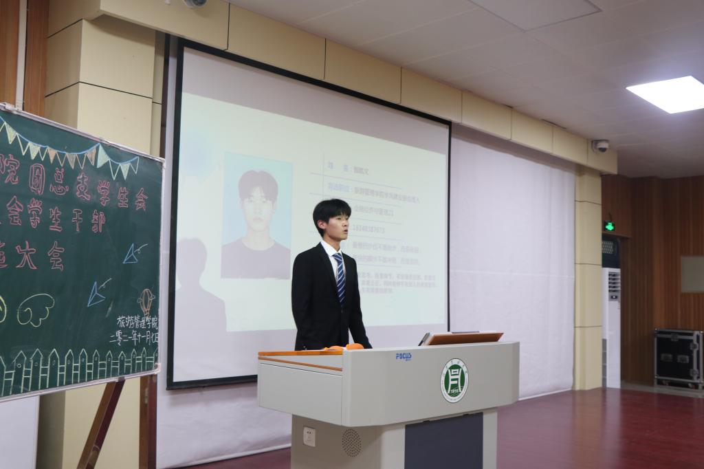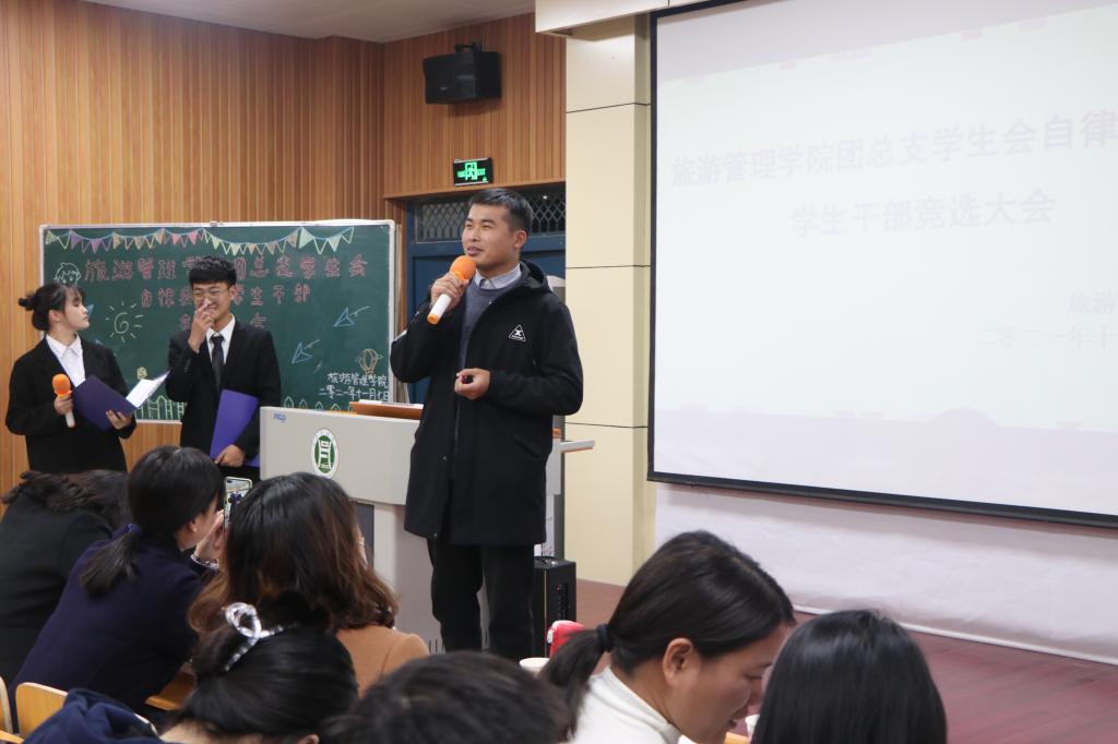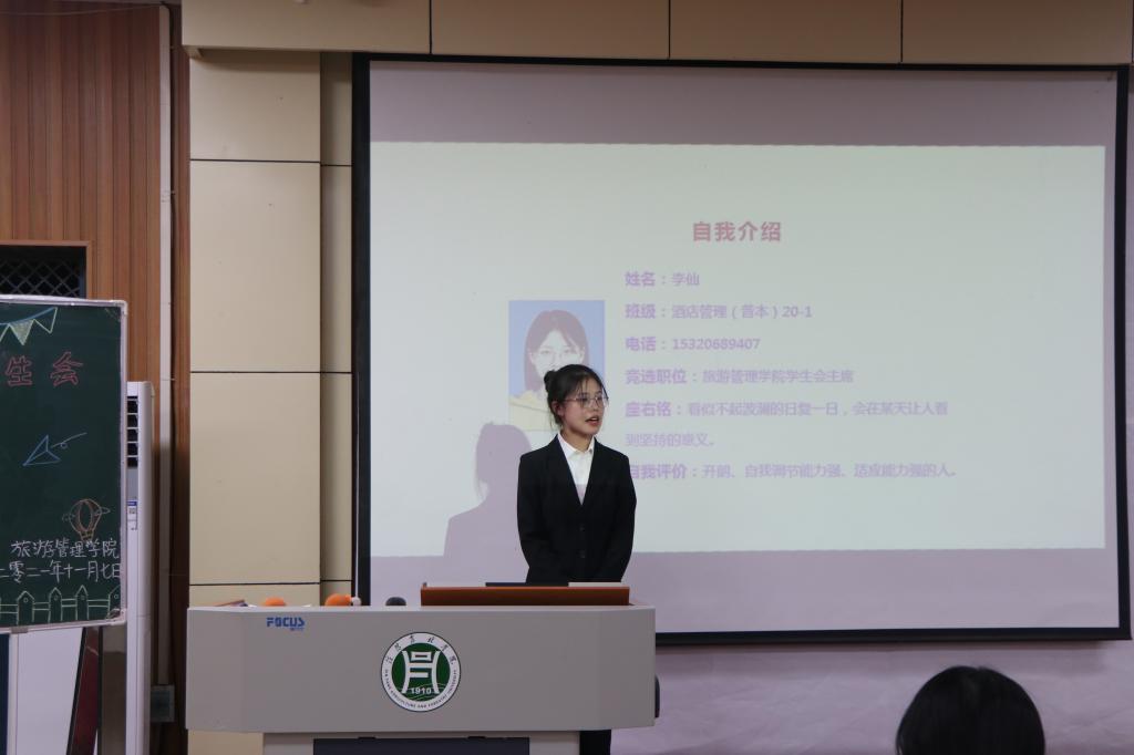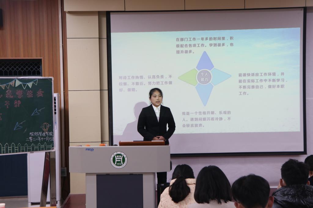 为促进我院学生管理工作的持续稳定发展,给学生管理队伍融入新鲜血液,同时给学生搭建一个展现自我、实践自我的平台,11月7日晚,旅游管理学院团总支学生会自律委员会干部换届竞选大会在二教204拉开帷幕。院党总支副书记杜丽、学工组全体老师、2020届团总支学生会自律委员会主席团成员及各部门学生干部代表以及20级学生代表参加了此次大会。