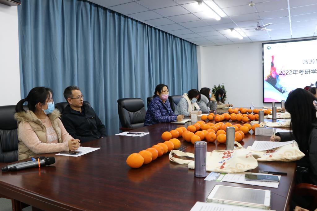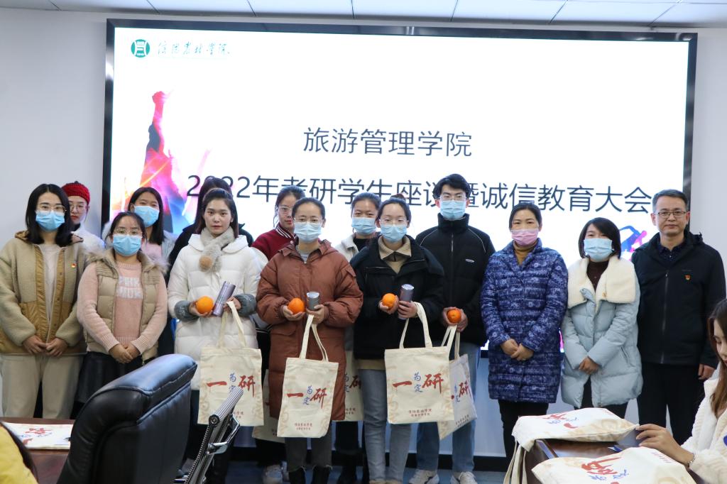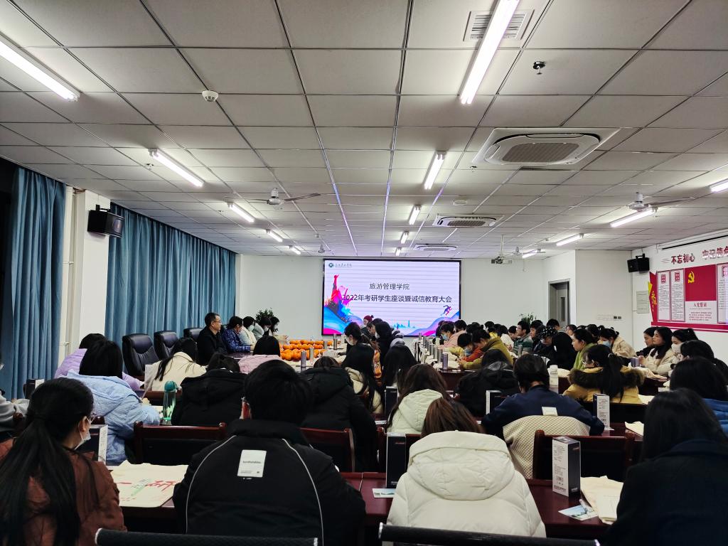 2021年12月21日,旅游管理学院在双创中心310召开了2022年考研学生座谈暨诚信教育大会。院党总支副书记杜丽、副院长陈婷、余兵、毕业班辅导员张春焕、王亚君、秦双飞及全院70余名考研学生参加了本次座谈会。