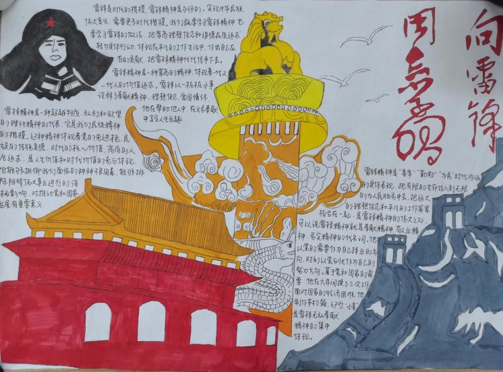 活动中,同学们态度认真,精心设计,内容丰富,图文并茂,将自己对雷锋精神的理解和感悟,纷纷凝练在了自己的作品中,有展示雷锋形象的,有描述雷锋事迹的,有赞扬雷锋“钉子精神”的,也有歌颂雷锋“全心全意为人民服务”高尚品质的……截止目前活动共收集优秀作品28幅,其中6幅优中选优的作品分别获得此次活动的一、二、三等奖。