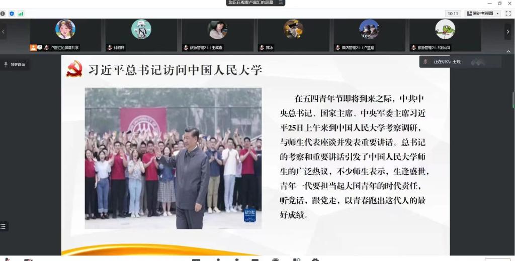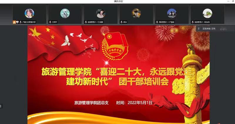 为迎接党的二十大的胜利召开,庆祝中国共产主义青年团建团100周年,激励广大青年弘扬奋斗精神,永担青春使命,旅游管理学院于2022年5月1日通过腾讯会议召开了“喜迎二十大,永远跟党走,建功新时代”团干部培训会,院团总支、学生会、自律委员会主席团成员以及各班级团干部参加了会议,会议由团总支书记王芳老师主持。