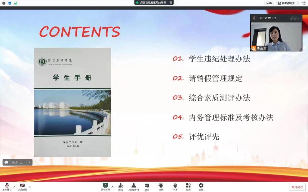 此次培训通过腾讯会议APP分三个部分进行,由学院团总支书记王芳主持。首先,王芳老师围绕寝室安全、网络安全、“防诈骗”等向大家进行安全教育,不仅向同学们强调了寝室安全的重要性及学校关于禁止在寝室使用大功率电器、杜绝寝室危险品及禁止违规操作水电线路等有关问题的相关规定,要求大家无条件严格遵守,同时帮助同学们正确辨别发生在身边的网络安全陷阱、电话及其他形式的诈骗活动,提高大家的防骗本领。接着,会议进入第二部分大学生的文明素养提升,王芳老师给同学们解读了文明素养提升对大学生人格培养的重要性,并以生动的案例教育和引导同学们新学期如何做一名富有涵养,讲文明,有礼貌的好学生。最后,王芳老师带领全体新生共同学习了《beat365在线平台官网学生手册》,并重点讲解了有关违规违纪处理、请销假管理制度、综合测评管理办法、评优评先有关程序、规定等内容。