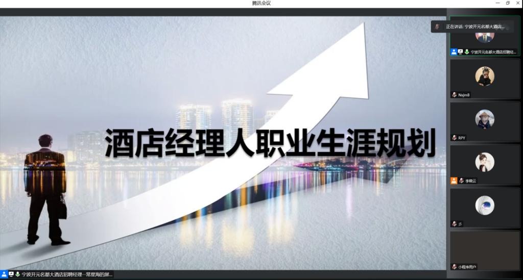 首先,常主管通过手机视频直播的方式带领同学们全方位参观了宁波开元名都大酒店,展示讲解了酒店户外环境、酒店大堂、总统套房,会议室及宴会厅等设施。接着,结合相关统计数据及实例,详细介绍了中国酒店业目前的发展趋势、人力资源供需情况、酒店业竞争格局、酒店业未来人才需求趋势等,并结合自己的职业成长经历,鼓励同学们积极做好职业规划。最后,同学们结合自身对旅游酒店行业的思考,与常主管进行了沟通和互动。大家纷纷表示,通过本次讲座对职业规划的重要性有了一定了解,也认识到在大学期间必须要认真学习专业技能、提升自我素养,为未来成为行业内具有竞争力的人才打好基础。(攥稿人:孟俞彤 审核人:陈婷)