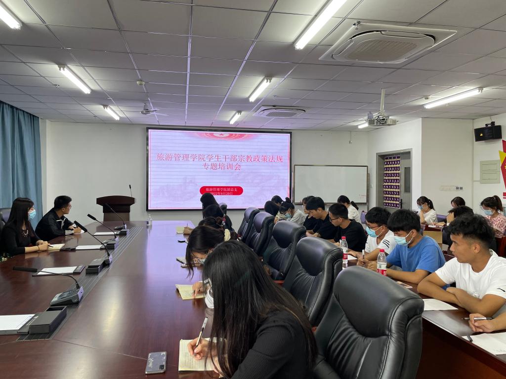 9月20日中午,旅游管理学院团总支在双创中心310会议室召开了学生干部宗教政策法规专题培训会,新生辅导员及全院学生干部参加了会议,会议由团总支书记王芳主持。
