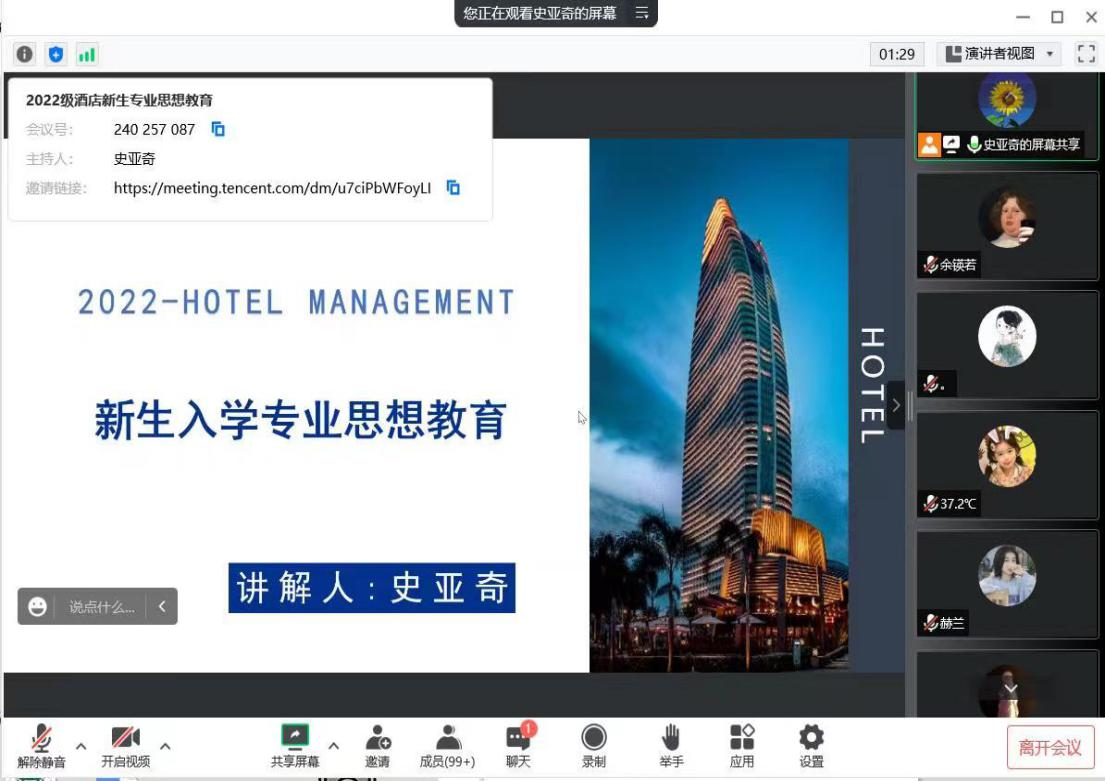 为使2022级新生增强专业认知,了解专业就业前景,树立正确的职业观、人生观,旅游管理学院于9月16日下午在线上进行了新生入学专业思想教育。旅游管理、酒店管理、会展经济与管理三个专业的教研室负责人分别为2022级新生做了详细的专业介绍,并与同学们进行了精彩互动。