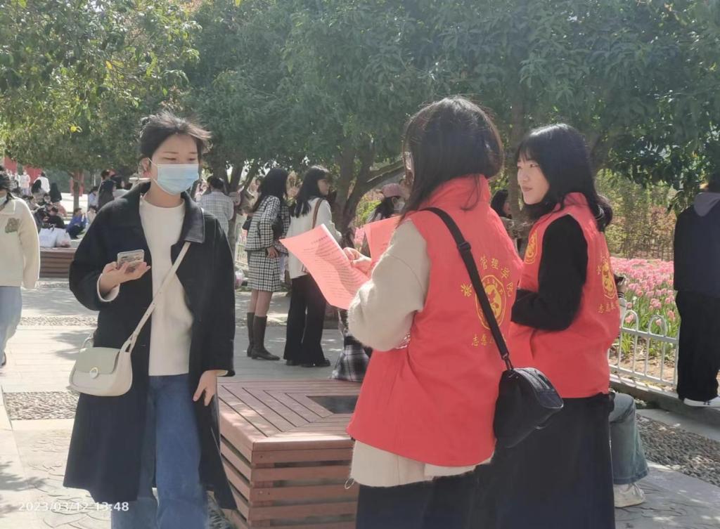 为学习贯彻党的二十大精神,践行习近平生态文明思想,增强同学们对于新时代雷锋精神的理解和感悟,旅游管理学院于2023年3月5日中午在信阳市百花园开展了“文明旅游,爱花护绿”志愿服务活动,21级学生干部代表、22级各班班长、团支参与了此次活动。
