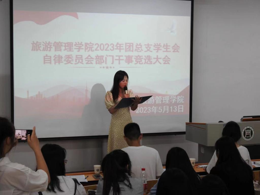 为进一步加强学院学生干部队伍建设,优化学生干部结构,5月13日中午,旅游管理学院在二教304顺利举办了2023年团总支学生会自律委员会部门干事竞选大会。院专、兼职辅导员张博、易冉、王佳倩、周新玲、陈芳等五位老师和学院现任主席团成员、各部门负责人以及22级竞聘人员参加了此次大会。