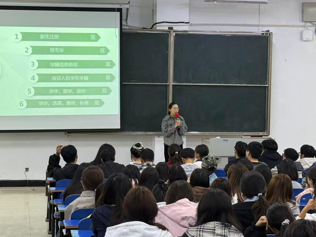 徐晓琰强调了学籍管理对大学生学业发展与成长的重要性,围绕新生入学注册的具体流程、转专业的操作规范、学籍信息更改的审批流程、应征入伍学生的保留学籍与恢复办法、休学与复学的办理要求、考试补修及重修的相关规定、学业预警的触发机制与应对措施,以及学分认定与毕业要求等内容进行了讲解。期间,徐晓琰对同学们提出的相关问题进行了解答,反复提醒同学们学籍管理规定与个人学业息息相关,应熟悉相关规章制度,严格遵守学校的学籍管理规定。