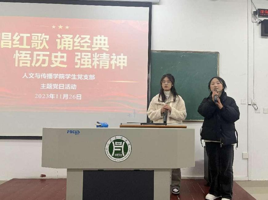 为深入开展学习贯彻习近平新时代中国特色社会主义思想主题教育,推动支部成员以红歌感悟历史,传承革命先辈奋斗精神,2023年11月27日,人文与传播学院学生党支部开展“唱红歌诵经典悟历史强精神”主题党日活动,活动以红色经典唱诵的形式开展。