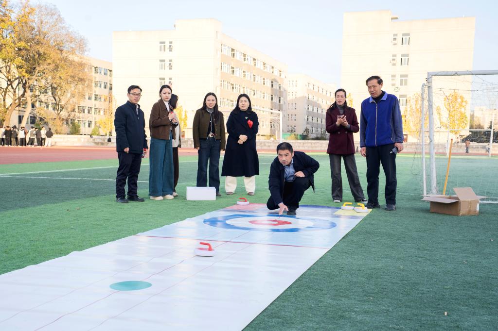 活动下半场转入“体育赋能”环节,在新操场举行。体育学院的老师们为我院教师带来了旱地冰壶、射箭、靶向飞盘和投壶四个项目的教学体验。我院教师被分为四个小组,分别是坚守信念组、胸怀全局组、团结奋进组和勇当前锋组。在体育老师们的专业指导下,大家积极参与各项体验项目,学习运动技巧,感受体育精神。赛场上,各队成员们通力协作,互相鼓劲,经过激烈的角逐,最终坚守信念组凭借出色的表现荣获第一名。