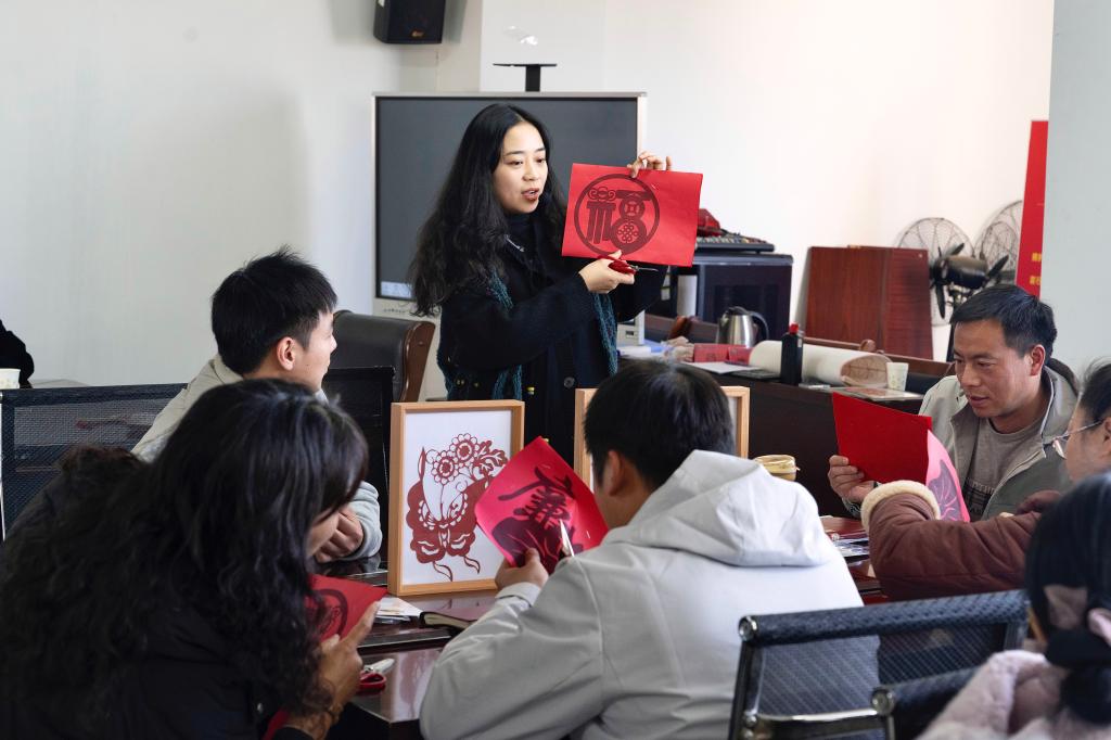 活动上半场聚焦“文化赋能”,在双创南楼六楼会议室举行。人文与传播学院专职组织员赵展首先为大家介绍了剪纸这项非物质文化遗产的悠久历史与民俗寓意,并演示了折纸、构图、下剪等关键技巧。在赵老师的悉心指导下,体育学院的老师们从生疏到熟练,一张张普通的红纸变成了栩栩如生的窗花、福字,让在场每一位老师深刻感受到了中华优秀传统文化的魅力。