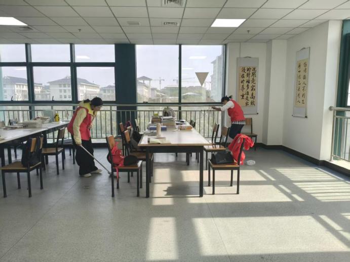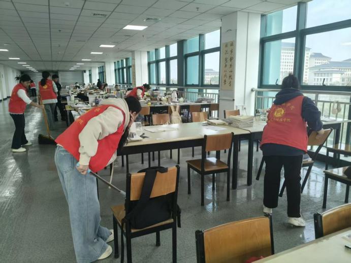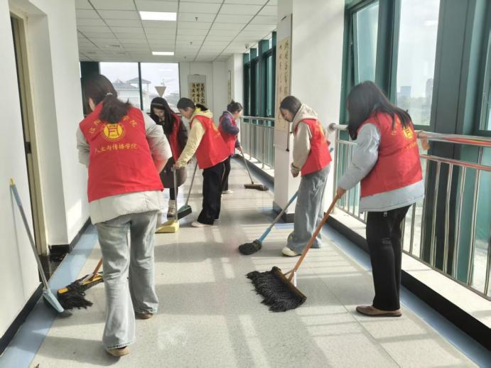 活动中,志愿者们身着统一的红色志愿马甲,分工协作、有序推进:有的手持扫帚清扫走廊地面,细致清理角落灰尘;有的擦拭门窗扶手,让公共区域焕然一新;还有的整理办公区域杂物,将桌椅摆放整齐。从走廊过道到会议室、从楼梯拐角到教师办公区,志愿者们不放过任何一处卫生死角,学院楼3楼的公共区域被打扫得整洁明亮,环境面貌得到明显改善。