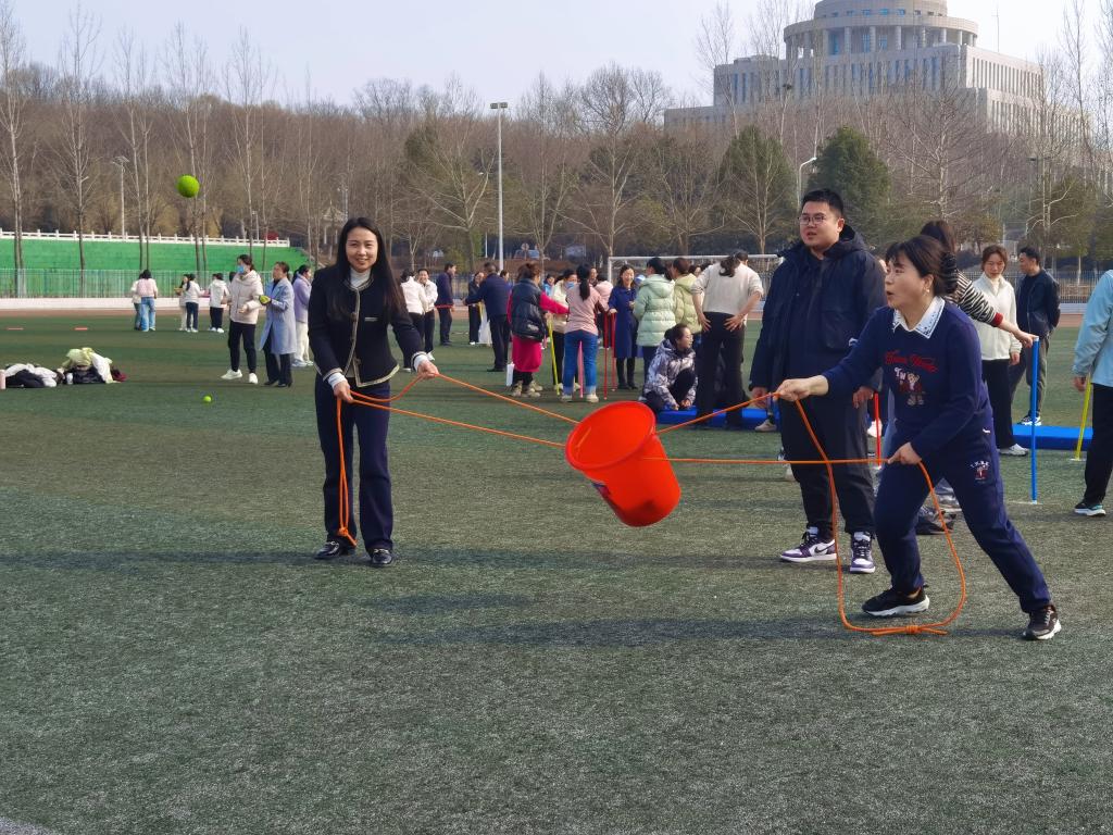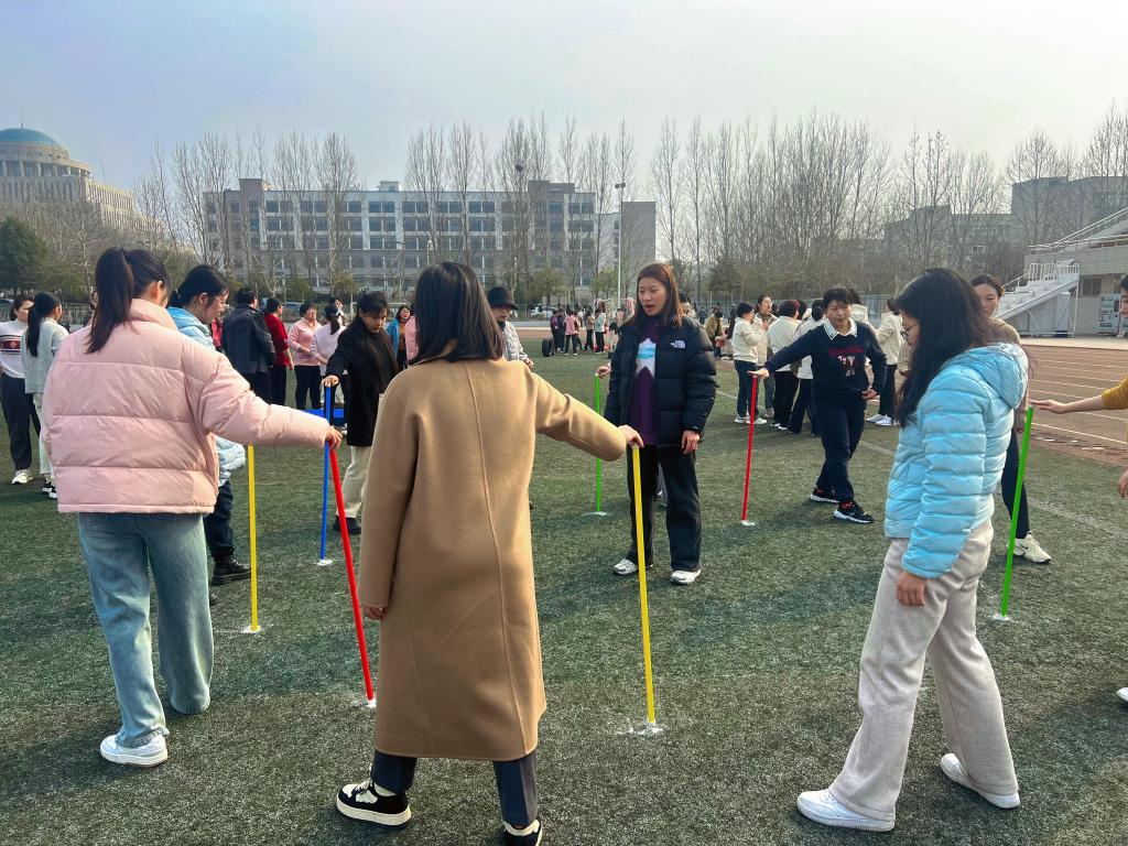 3月7日下午,我院女教职工们来到老田径场,为趣味拓展比赛积极热身,在一片欢声笑语中,各类比赛项目相继进行——“不倒森林”“平地而起”“珠行万里”“击鼓颠球”“奔跑车轮”“投掷能手”,她们团结一致、配合默契、表现出色,最终荣获“道德风尚奖”。