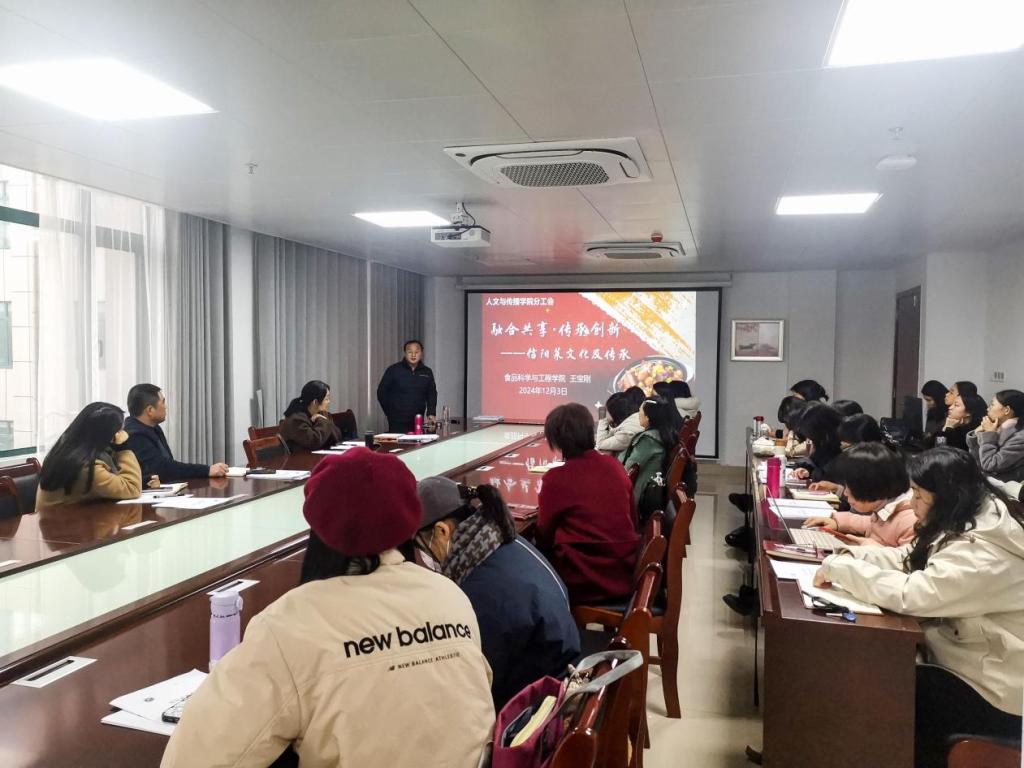 12月3日,为弘扬信阳地区饮食文化,倡导健康、科学、均衡的饮食理念,人文与传播学院分工会特邀beat365在线平台官网国务院特殊津贴专家、全国餐饮职业教育优秀教师王宝刚,为我院全体教职工开展“融合共享,传承创新——信阳菜文化及传承”精彩讲座。