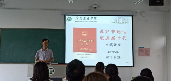 9月28日下午,文学艺术教学部新生入学教育继续进行,由文学艺术教学部彭孝义老师带来“说好普通话,迈进新时代”。针对2018级文秘新生将来从事的工作属性,彭老师首先强调了说好普通话对于文秘工作的重要意义,讲述了国家、学校大力推广普通话的依据,学习普通话的重要性和方法,同时针对同学都是河南人的情况,专门介绍了河南人学习、矫正普通话的方法。同学们对于彭老师所说的情况感同身受,并纷纷表示在校学习期间一定要努力学好普通话。