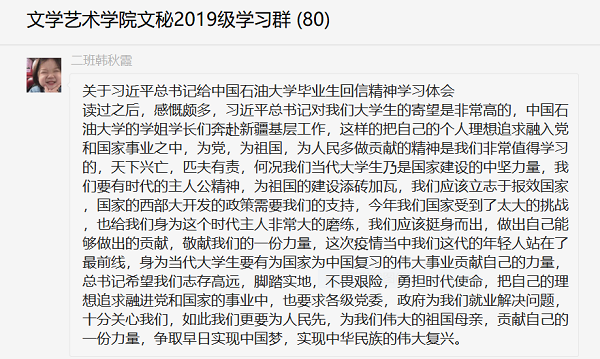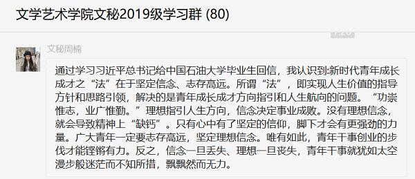 文学艺术学院全体青年学子学习习近平总书记给中国石油大学(北京)克拉玛依校区毕业生的回信