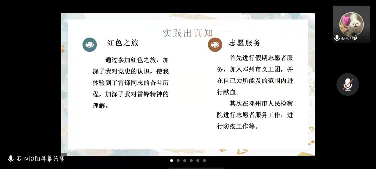 会议伊始,王蕾老师以雷锋这名伟大革命战士的人物视角,围绕雷锋个人事迹、雷锋精神孕育成长、雷锋精神永远传承这三个方面,讲述了在中国共产党百年奋斗的光辉历史和成就下,诞生的雷锋精神,回答了为何雷锋精神能代代相传至今,深刻解读了雷锋精神是现代社会需要的温暖力量。随后、王老师对同学们在寒假期间开展的“5+X”社会实践活动的完成情况和存在的问题进行总结,优秀个人石心怡、吕红艳、刘婧分别分享了在各自工作与志愿服务经历中的经验与感受,以自身对志愿服务的认识讲述参与志愿活动的收获。分享会结束后,朱迪同学对本次雷锋月活动进行了总结。