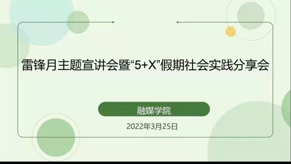 为进一步深化学雷锋活动,培养大学生关爱他人、服务社会的优良品质。3月25日下午,融媒学院在腾讯会议开展雷锋精神宣讲会暨“5+X”社会实践分享会。院团总支书记王蕾老师参加本次会议,会议由学生会主席朱迪主持。