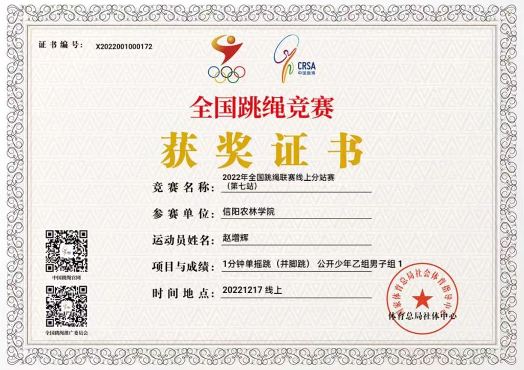 10月28日-12月17日,由国家体育总局社会体育指导中心、全民健身活动推广与指导委员会、全国跳绳推广委员会主办,上海大健石体育文化传播有限公司承办的2022年全国跳绳联赛线上分站赛(第六站)(第七站)圆满结束。我院赵增辉同学首次参赛,表现突出,荣获一金一银的好成绩。