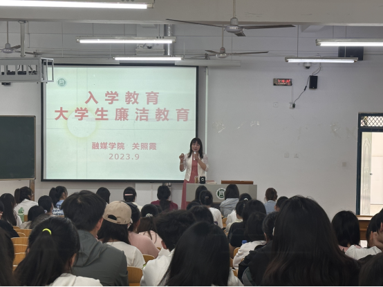 为加强大学生廉洁教育,培养学生良好的道德行为规范,营造崇廉敬洁、廉洁自律的校园氛围,2023年9月25日,融媒学院党总支书记关照霞为2023级新生上廉洁教育第一课,引导学生形成正确的价值观,扣好“人生第一粒扣子”,坚持为党育人、为国育才,坚决落实立德树人根本任务。