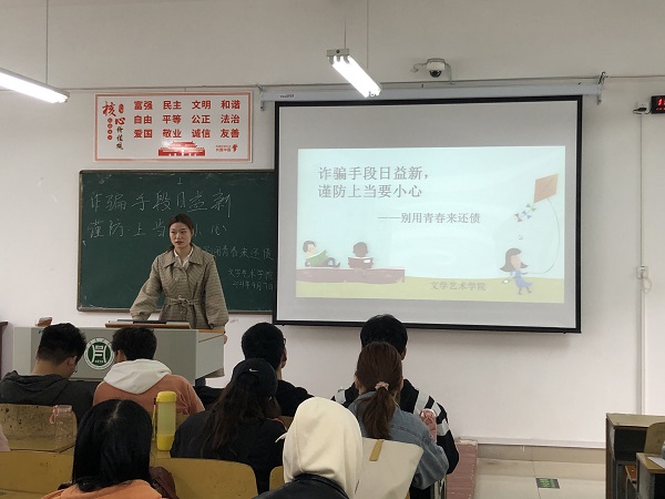近期,大学生互联网消费贷款的乱象引发各界关注,校园诈骗、校园贷的警铃已拉响。为提高大学生的自我防范意识,拒绝“校园贷”进入校园,2021年4月7日中午,文学艺术学院勤工部于二教312B教室为大一新生开展以“诈骗手段日益新,谨防上当要小心”为主题的反校园“诈骗”班会。