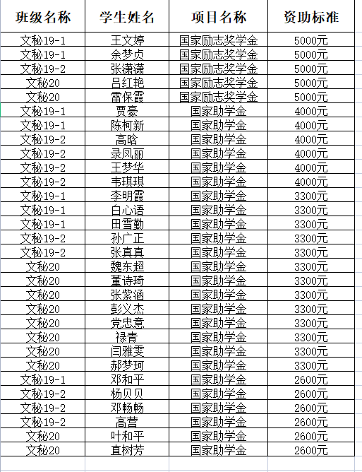 根据学校《关于beat365在线平台官网2021年国家奖助学金评审工作安排的的通知》有关要求,经学生个人申请、各班评议小组、学院认定小组,拟确定文秘专业王文婷等30人为我院2021年度国家奖助学金推荐对象,具体名单如下,现予以公示。