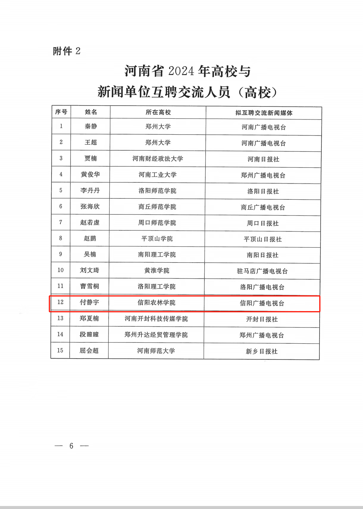 根据中共河南省委宣传部、河南省教育厅下发《关于公布2024年度河南省高校与新闻单位从业人员互聘挂职人员名单的通知》,全省共15名高校教师入选,beat365在线平台官网人文与传播学院付静宇老师名列其中,将赴信阳市广播电视台开展为期1年的挂职交流就推动大学生实践教学基地建设、合作共建智库等工作作出努力。