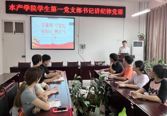 水产学院学生第一、第二党支部分别以“学条例 守党纪 铭初心 树正气”和“强化纪律学习 夯实思想根基”为主题展开深入学习与讨论。水产学院学生第二党支部书记刘开放强调,各位学生党员要自觉站在坚定拥护“两个确立”、坚决做到“两个维护”的高度,深刻理解把握党纪学习教育的重大意义、目标要求和具体任务,强化自我约束,做到自警、自省、自知,自觉将纪律内化于心、外化于行。