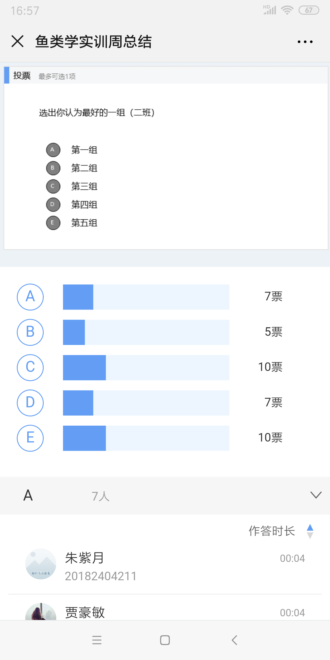 实训周以小组为单位,依次完成所有项目,每个项目都提交一份作品或书面作业,作为小组成绩,然后小组制作PPT并进行汇报和总结,小组完成的鱼拓由各代表讲解后同学们借助“雨课堂”进行投票选出最好的作品。个人成绩则根据实训考试、实训日志、实习总结和组内表现等来评分,通过多种方式的考核和评价来强化实训周的学习效果。