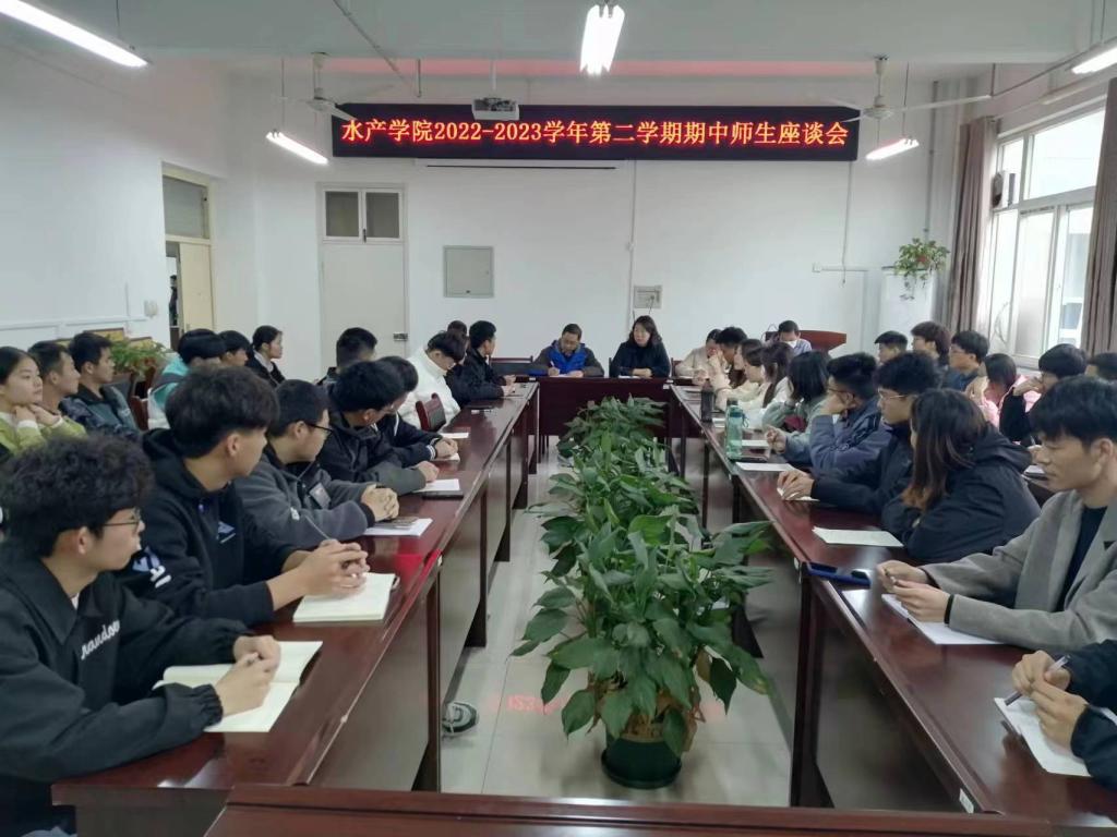 2023年4月24日中午,水产学院于2C328召开2022-2023学年第二学期期中师生座谈会。水产学院党总支副书记黄光玲,教学副院长伦峰,教学秘书刘俊、专业教师彭新亮、苏超群、田媛及2019级、2021级、2022级各班学生代表。