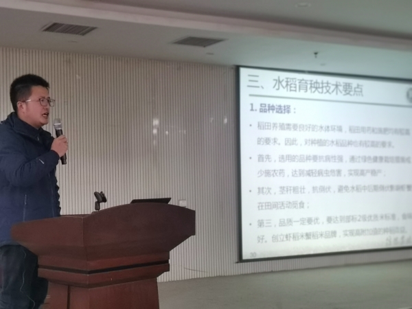1月10日上午,季新博士为淮滨县稻渔综合种养合作社负责人进行了《稻渔综合种养水稻栽培技术》的培训,冯德祥博士进行了《稻虾综合种养技术》的培训,详细讲解了稻渔综合种养过程中水稻品种选择、水稻育秧技术要点、水稻移栽及管理技术要点、水稻钵苗机械摆载新技术、稻渔品种的选择、稻虾养殖技术等内容。培训结束后两位博士回答了合作社负责人提出的技术问题。