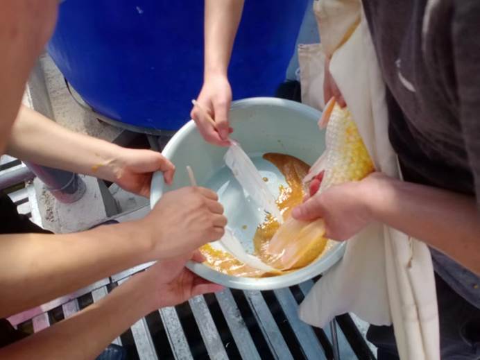 为提升全院师生特别是年轻教师的实践动手能力,进一步促进学院科研水平上台阶、接地气,水产学院科研团队从去年12月份开始积极谋划校内工厂化繁育基地苗种繁育工作,先后引进锦鲤、团头鲂和黄尾鲴亲本在基地进行精心培育。5月20日至6月6日,科研团队通过亲鱼挑选、催产、人工授精、受精卵脱黏、孵化等一系列技术规程,成功孵化锦鲤、团头鲂和黄尾鲴鱼苗共计100多万尾,目前已全部下塘进行苗种培育。