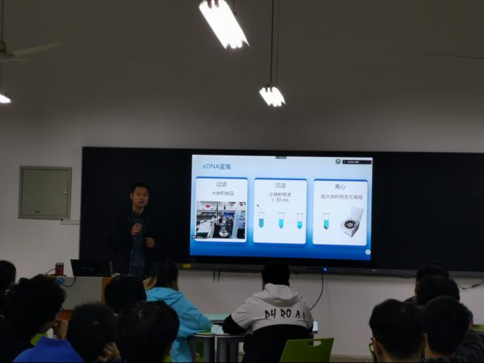 苏超群博士从认识eDNA技术、eDNA技术的实际应用、eDNA技术展望三个方面给师生介绍了环境DNA技术在科研研究方面的探索,结合自己在水库鱼类资源调查的研究探究了eDNA技术在单一物种检测、鱼类群落检测以及种群遗产学检测等方面的实际应用,明确环境DNA技术在鱼类资源调查中可行性、低成本性。苏超群博士通过通俗易懂的语言将比较抽象的科研内容清晰地介绍给师生。报告会后,同学们与苏老师进行了相关内容的交流与沟通,一些感兴趣的大三本科生将和苏博士一起进行这方面的后续研究。