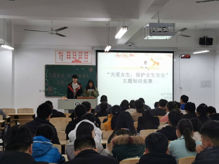 当今时代,大学生心理健康问题日渐成为人们的关注,特别是大学女生懵懂的青春时期,对很多自身心理以及生理问题了解尚少,为提高女生对青春期健康知识的认识,提升自我保护能力,2019年12月10日晚上,水产学院开展了“关爱女生,保护女生安全”主题知识竞赛。本次活动由院学习部和女生部以及心理部主办,19级全体同学进行参与,并邀请19级辅导员段丁毓、苏超群老师担任评委。