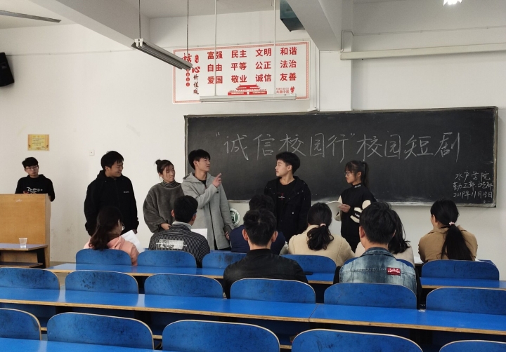 为了进一步普及学生资助政策,培养大学生的诚信意识和观念,树立诚信自强的典型人物,扩大社会影响力。增强学生的诚信意识,丰富大学生的业余生活。我院在学校“诚信校园行”大赛号召下,于11月18日中午在一教a203教室举行“诚信校园行”校园短剧初赛。水产学院学工组资助专员李建玲老师以及19级辅导员段丁毓老师,18级、19级学生参加了此次竞选。