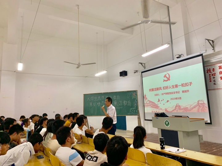 2019年9月25日下午五点,水产学院党总支书记郭旭升在二教404为全体19级新生,以“树廉洁新风,扣好人生第一粒扣子”为主题开展了大学生廉洁教育专题讲座。