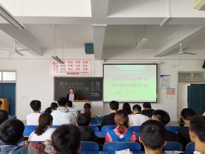 4月17日中午,水产学院团总支于一教A205开展“践行三大精神,建功出彩河南”主题团课。此次团课由团总支书记晏方舟主讲,院第六届团总支学生会主席团成员、2018级全体学生会干部以及各班班干部参加了此次团课。