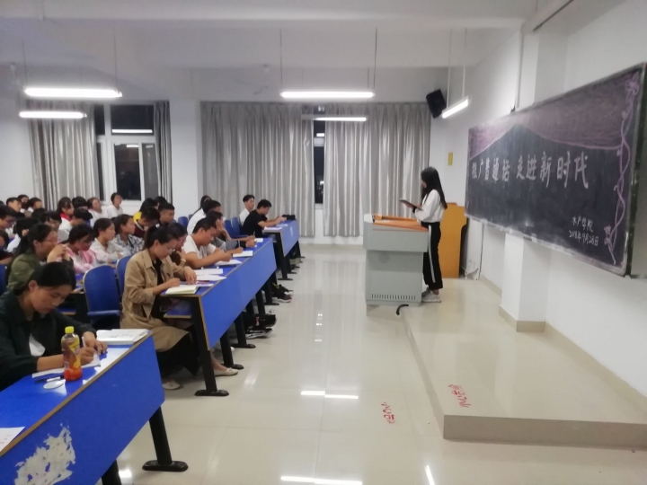为积极响应“推广普通话活动”号召,提升我院师生语言能力,传承发展中华优秀传统文化,为构建和谐向上的校园文化营造良好的语言环境,水产学院于9月26日晚在一教A203教室开展 “说好普通话,迈进新时代”主题朗诵比赛,活动由18级新生辅导员李建玲老师主持, 18级全体新生及大二学生代表参加。