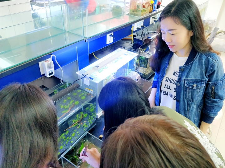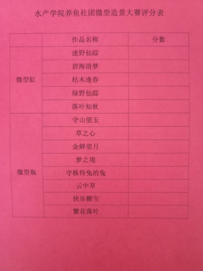 5月14日中午,水产学院养鱼社团在水族造景实验室举办微型水族造景大赛。本次大赛在院领导的大力支持下,由水产学院团总支策划,养鱼社团承办。大赛要求参赛选手在规定时间内现场构思、选材、制作,提高了比赛的时效性、趣味性和难度系数。主持人一声开始令下,选手们迅速进入比赛状态,或构思、或挑选材料,3个小时的赛程,现场气氛紧张而激烈。这是一次专业知识的比拼,也是一场才华情怀的展示。来自水产学院的20位选手,以团队或个人的方式参赛,共完成13个参赛作品。其中微型缸造景作品5个,微型瓶造景作品8个。经过学院老师组成的评委团认真品评打分,最终17级水产养殖学普本班王磊的作品《迷野仙踪》、17级水产养殖技术班袁慧云的作品《快乐糖宝》获得一等奖。(晏方舟)