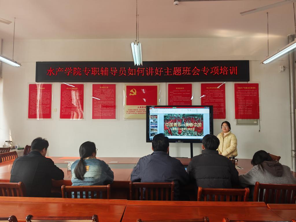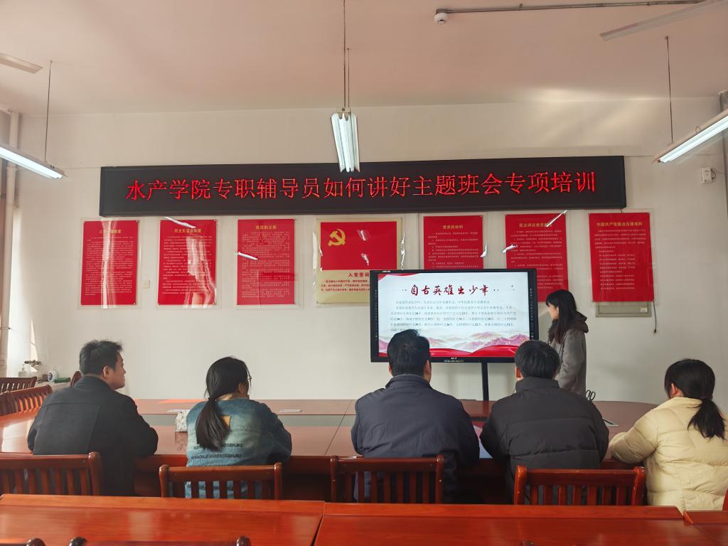 为提升专职辅导员思想政治教育能力,规范主题班会组织流程,12月11日,水产学院在330会议室组织开展了“专职辅导员如何讲好主题班会”专题培训,水产学院全体专职学工队伍参加了此次培训。