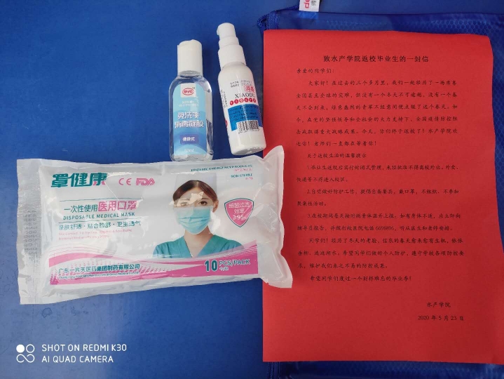 返校毕业生在学校工作人员和教师志愿者的引导下,保持1米以上安全间隔有序排队,在消毒区逐一进行消毒,然后进行体温测量,体温测量正常进入健康信息登记区扫码、登记,经检查人员核查后方可入校。一进入校门,同学们就能感受到水产学院老师们欢迎他们回家的满满关心和温暖。一份防疫大礼包,里面有一包医用口罩、一瓶消毒凝胶、一瓶医用酒精等必备物资;一封致返校毕业生的信,饱含老师对同学们的深情和祝福,还有返校生活期间的温馨提示,指导同学们度过安全有序的在校时光;一个志愿服务车队,老师们纷纷带着私家车,帮助同学们来回运送行李;一支党员志愿者队伍,为毕业生们分拣、整理、打包宿舍物品,认真细致,汗流浃背,在所不辞。